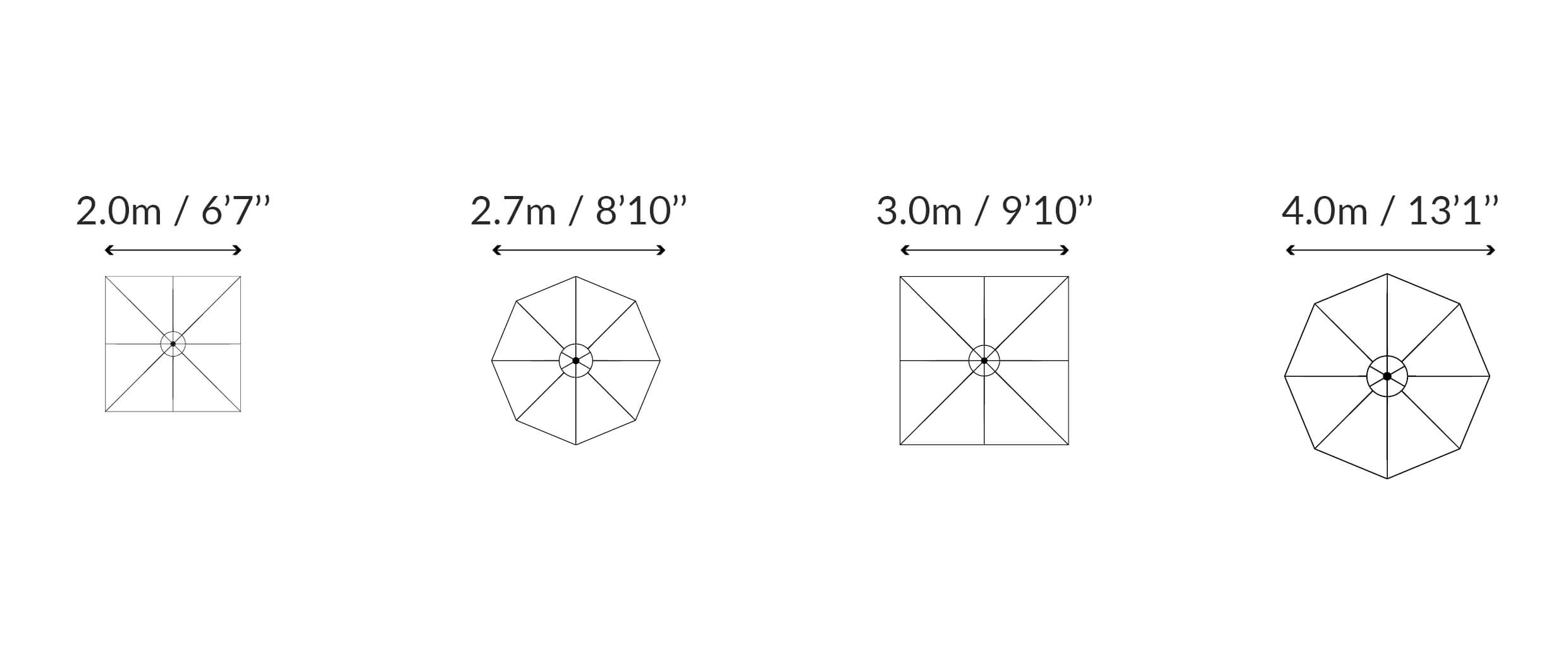 simplicity. Strong and durable, this umbrella can be easily operated by just one person. There are four sizes and a variety of canopy